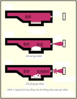 Bên trong đầu phun của hệ thống có bộ phận gia nhiệt. Bộ phận này đóng/mở do máy tính điều khiển. Khi mở, nhiệt độ tại họng phun tăng lên, tạo ra bóng khí, bóng khí tạo sức nén bắn giọt mực ra ngoài, mực khác lại tiếp tục được đưa vào họng phun. Đầu phun của hệ thống có thể được sắp xếp theo hàng hoặc theo bố cục nhất định, sự di chuyển của đầu phun tạo nên hình ảnh trên bản in.